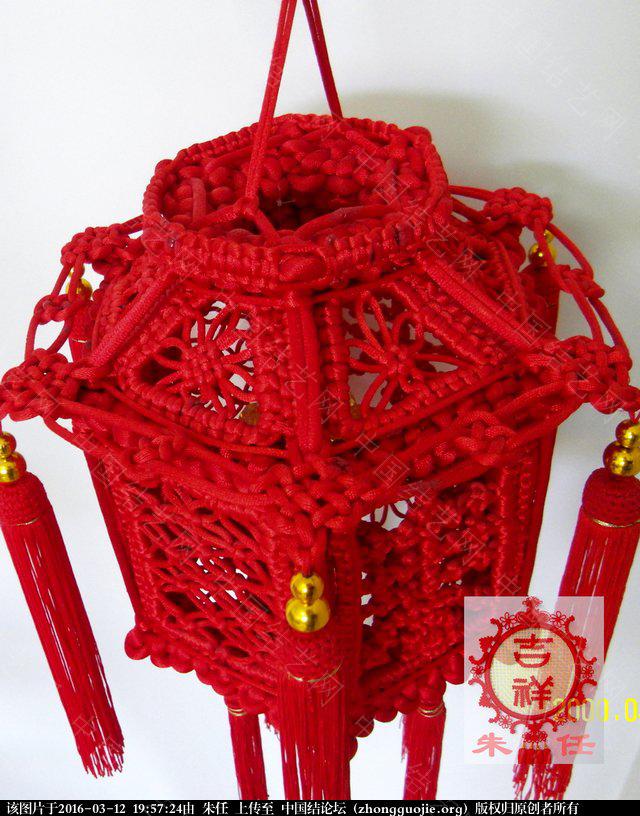 上面的作品我起名叫《中国结艺立体宫灯》,是我10年前编的;当时,好多新结我还不会编。这个立体宫灯我用一月时间编成。